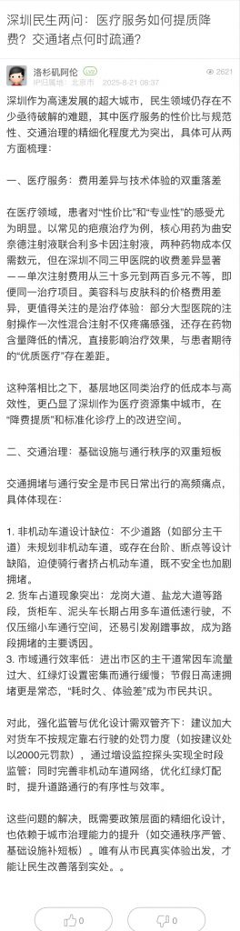 15. 帖文《深圳民生兩問:醫(yī)療服務(wù)如何提質(zhì)降費(fèi)?交通堵點(diǎn)何時(shí)疏通?》