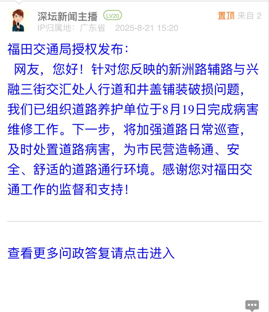網(wǎng)友,您好!針對您反映的新洲路輔路與興融三街交匯處人行道和井蓋鋪裝破損問題,我們已組織道路養(yǎng)護(hù)單位于8月19日完成病害維修工作。下一步,將加強(qiáng)道路日常巡查,及時(shí)處置道路病害,為市民營造暢通、安全、舒適的道路通行環(huán)境。感謝您對福田交通工作的監(jiān)督和支持!