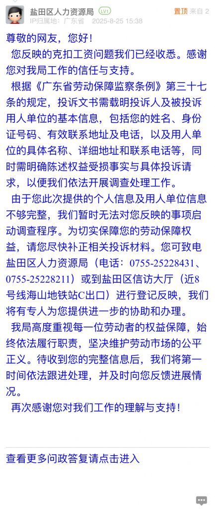 由于您此次提供的個(gè)人信息及用人單位信息不夠完整,我們暫時(shí)無法對您反映的事項(xiàng)啟動(dòng)調(diào)查程序。為切實(shí)保障您的勞動(dòng)保障權(quán)益,請您盡快補(bǔ)正相關(guān)投訴材料。您可致電鹽田區(qū)人力資源局(電話:0755-25228431、0755-25228211)或到鹽田區(qū)信訪大廳(近8號線海山地鐵站C出口)進(jìn)行登記反映,我們將有專人為您提供進(jìn)一步的協(xié)助和辦理。