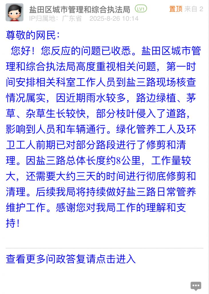 您好!您反應(yīng)的問題已收悉。鹽田區(qū)城市管理和綜合執(zhí)法局高度重視相關(guān)問題,第一時(shí)間安排相關(guān)科室工作人員到鹽三路現(xiàn)場核查情況屬實(shí),因近期雨水較多,路邊綠植、茅草、雜草生長較快,部分枝葉侵入了道路,影響到人員和車輛通行。綠化管養(yǎng)工人及環(huán)衛(wèi)工人前期已對部分路段進(jìn)行了修剪和清理。因鹽三路總體長度約8公里,工作量較大,還需要大約三天的時(shí)間進(jìn)行徹底修剪和清理。后續(xù)我局將持續(xù)做好鹽三路日常管養(yǎng)維護(hù)工作。感謝您對我局工作的理解和支持!