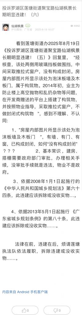 10. 帖文《投訴羅湖區(qū)蓮塘街道聚寶路仙湖楓景長期明顯違建!(六)》