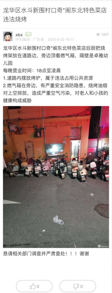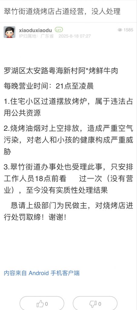 1. 帖文《翠竹街道燒烤店占道經(jīng)營,沒人處理》
