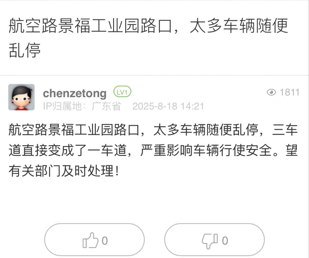 2. 帖文《航空路景福工業(yè)園路口,太多車輛隨便亂停》