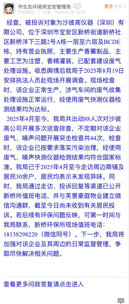 經(jīng)查,被投訴對象為沙彼高儀器(深圳)有限公司,位于深圳市寶安區(qū)新橋街道新橋社區(qū)新橋洋下三路2號A棟一層至六層及BCDE棟,持有營業(yè)執(zhí)照,主要生產(chǎn)香薰制品,主要工藝為注塑、香精灌裝,已配套建設(shè)廢氣處理設(shè)施。收悉輿情后我局于2025年8月19日安排執(zhí)法人員赴現(xiàn)場開展調(diào)查?,F(xiàn)場檢查時(shí),該企業(yè)正常生產(chǎn),涉氣車間的廢氣收集處理設(shè)施正常運(yùn)行,經(jīng)使用廢氣快測儀器檢測結(jié)果均為達(dá)標(biāo)。