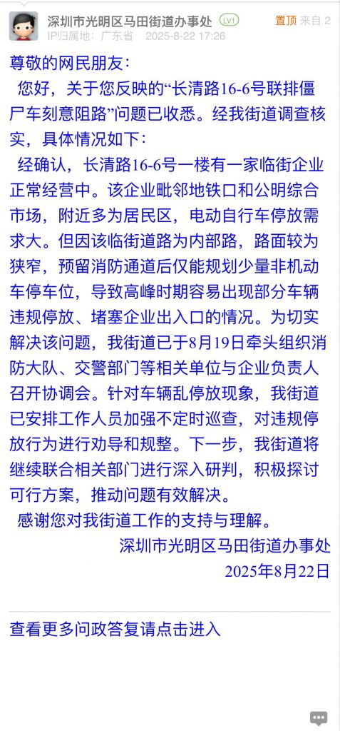 19. 帖文《光明區(qū)馬田街道長清路16-6號(中泰花園后面)“聯(lián)排僵尸車”刻意阻路》