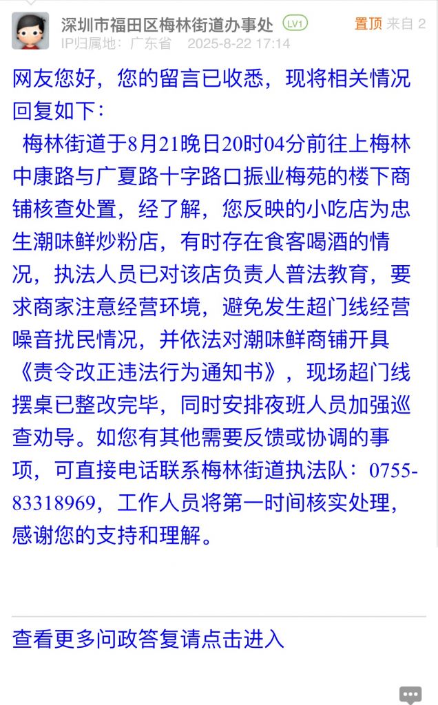 梅林街道于8月21晚日20時(shí)04分前往上梅林中康路與廣夏路十字路口振業(yè)梅苑的樓下商鋪核查處置,經(jīng)了解,您反映的小吃店為忠生潮味鮮炒粉店,有時(shí)存在食客喝酒的情況,執(zhí)法人員已對該店負(fù)責(zé)人普法教育,要求商家注意經(jīng)營環(huán)境,避免發(fā)生超門線經(jīng)營噪音擾民情況,并依法對潮味鮮商鋪開具《責(zé)令改正違法行為通知書》,現(xiàn)場超門線擺桌已整改完畢,同時(shí)安排夜班人員加強(qiáng)巡查勸導(dǎo)。如您有其他需要反饋或協(xié)調(diào)的事項(xiàng),可直接電話聯(lián)系梅林街道執(zhí)法隊(duì):0755-83318969,工作人員將第一時(shí)間核實(shí)處理,感謝您的支持和理解。