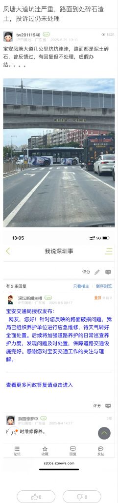 20. 帖文《鳳塘大道坑洼嚴(yán)重,路面到處碎石渣土,投訴過仍未處理》