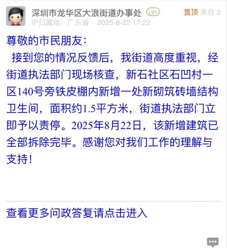 接到您的情況反饋后,我街道高度重視,經(jīng)街道執(zhí)法部門現(xiàn)場核查,新石社區(qū)石凹村一區(qū)140號旁鐵皮棚內(nèi)新增一處新砌筑磚墻結(jié)構(gòu)衛(wèi)生間,面積約1.5平方米,街道執(zhí)法部門立即予以責(zé)停。2025年8月22日,該新增建筑已全部拆除完畢。感謝您對我們工作的理解與支持!