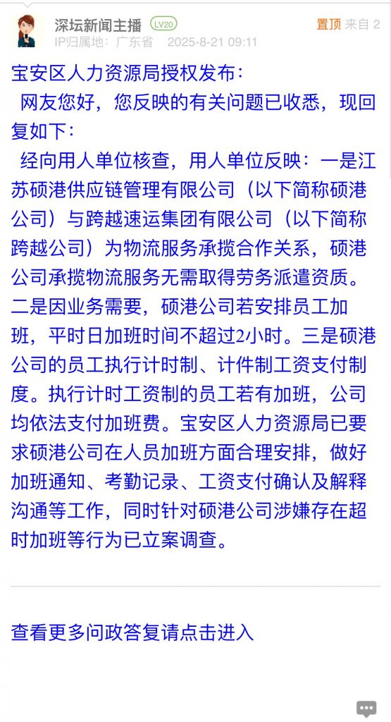 經(jīng)向用人單位核查,用人單位反映:一是江蘇碩港供應(yīng)鏈管理有限公司(以下簡稱碩港公司)與跨越速運(yùn)集團(tuán)有限公司(以下簡稱跨越公司)為物流服務(wù)承攬合作關(guān)系,碩港公司承攬物流服務(wù)無需取得勞務(wù)派遣資質(zhì)。二是因業(yè)務(wù)需要,碩港公司若安排員工加班,平時(shí)日加班時(shí)間不超過2小時(shí)。三是碩港公司的員工執(zhí)行計(jì)時(shí)制、計(jì)件制工資支付制度。執(zhí)行計(jì)時(shí)工資制的員工若有加班,公司均依法支付加班費(fèi)。寶安區(qū)人力資源局已要求碩港公司在人員加班方面合理安排,做好加班通知、考勤記錄、工資支付確認(rèn)及解釋溝通等工作,同時(shí)針對碩港公司涉嫌存在超時(shí)加班等行為已立案調(diào)查。