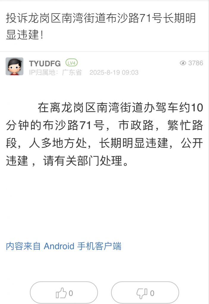 5. 帖文《投訴龍崗區(qū)南灣街道布沙路71號長期明顯違建!》