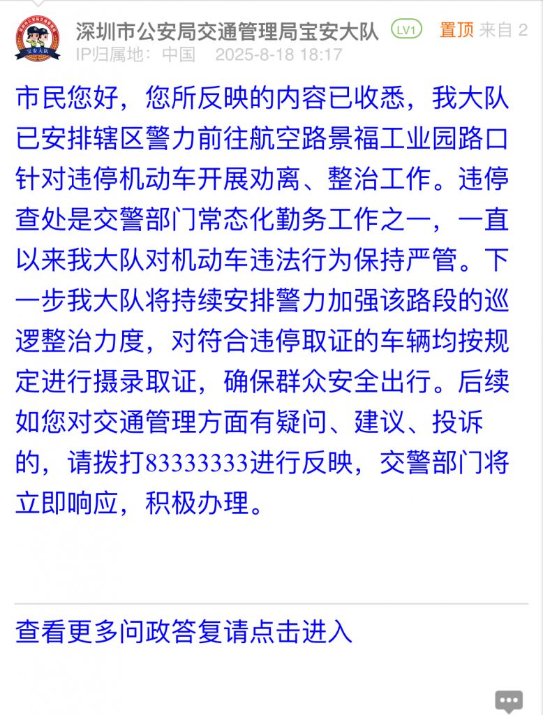 市民您好,您所反映的內(nèi)容已收悉,我大隊(duì)已安排轄區(qū)警力前往航空路景福工業(yè)園路口針對違停機(jī)動(dòng)車開展勸離、整治工作。違停查處是交警部門常態(tài)化勤務(wù)工作之一,一直以來我大隊(duì)對機(jī)動(dòng)車違法行為保持嚴(yán)管。下一步我大隊(duì)將持續(xù)安排警力加強(qiáng)該路段的巡邏整治力度,對符合違停取證的車輛均按規(guī)定進(jìn)行攝錄取證,確保群眾安全出行。后續(xù)如您對交通管理方面有疑問、建議、投訴的,請撥打83333333進(jìn)行反映,交警部門將立即響應(yīng),積極辦理。