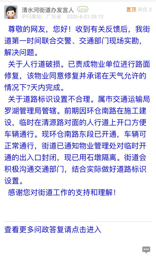 關(guān)于道路標(biāo)識(shí)設(shè)置不合理。屬市交通運(yùn)輸局羅湖管理局管轄。前期因環(huán)倉南路在施工建設(shè),臨時(shí)在清源路對面的人行道上開口方便車輛通行。現(xiàn)環(huán)倉南路東段已開通,車輛可正常通行,街道已通知物業(yè)管理處對臨時(shí)開通的出入口封閉,現(xiàn)已用石墩隔離。街道會(huì)積極溝通交通部門,結(jié)合實(shí)際做好道路標(biāo)識(shí)設(shè)置。