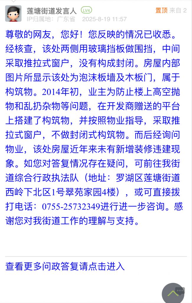 尊敬的網(wǎng)友,您好!您反映的情況已收悉。經(jīng)核查,該處兩側(cè)用玻璃擋板做圍擋,中間采取推拉式窗戶,沒有構(gòu)成封閉。房屋內(nèi)部圖片所顯示該處為泡沫板墻及木板門,屬于構(gòu)筑物。2014年初,業(yè)主為防止樓上高空拋物和亂扔雜物等問題,在開發(fā)商贈(zèng)送的平臺(tái)上搭建了構(gòu)筑物,并按照物業(yè)指導(dǎo),采取推拉式窗戶,不做封閉式構(gòu)筑物。而后經(jīng)詢問物業(yè),該處房屋近年來未有新增裝修違建現(xiàn)象。如您對答復(fù)情況存在疑問,可前往我街道綜合行政執(zhí)法隊(duì)(地址:羅湖區(qū)蓮塘街道西嶺下北區(qū)1號翠苑家園4樓),或可直接撥打電話:0755-25732349進(jìn)行進(jìn)一步咨詢。感謝您對我街道工作的理解與支持。