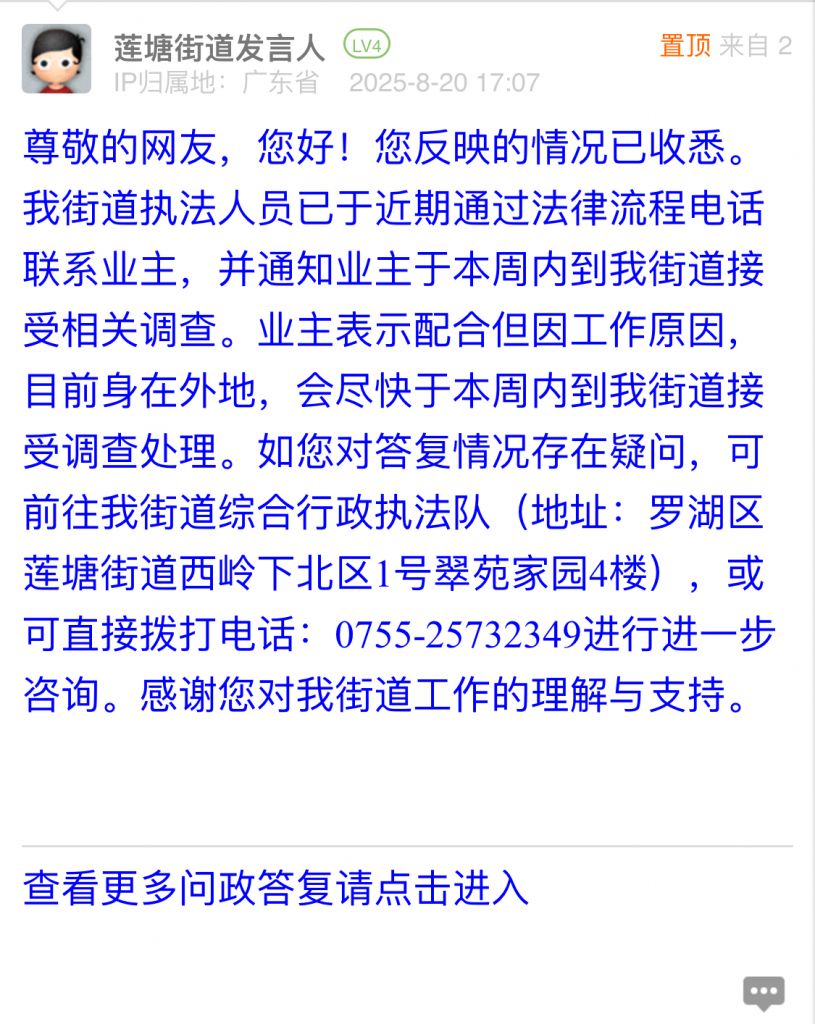 尊敬的網(wǎng)友,您好!您反映的情況已收悉。我街道執(zhí)法人員已于近期通過法律流程電話聯(lián)系業(yè)主,并通知業(yè)主于本周內(nèi)到我街道接受相關(guān)調(diào)查。業(yè)主表示配合但因工作原因,目前身在外地,會(huì)盡快于本周內(nèi)到我街道接受調(diào)查處理。如您對答復(fù)情況存在疑問,可前往我街道綜合行政執(zhí)法隊(duì)(地址:羅湖區(qū)蓮塘街道西嶺下北區(qū)1號翠苑家園4樓),或可直接撥打電話:0755-25732349進(jìn)行進(jìn)一步咨詢。感謝您對我街道工作的理解與支持。