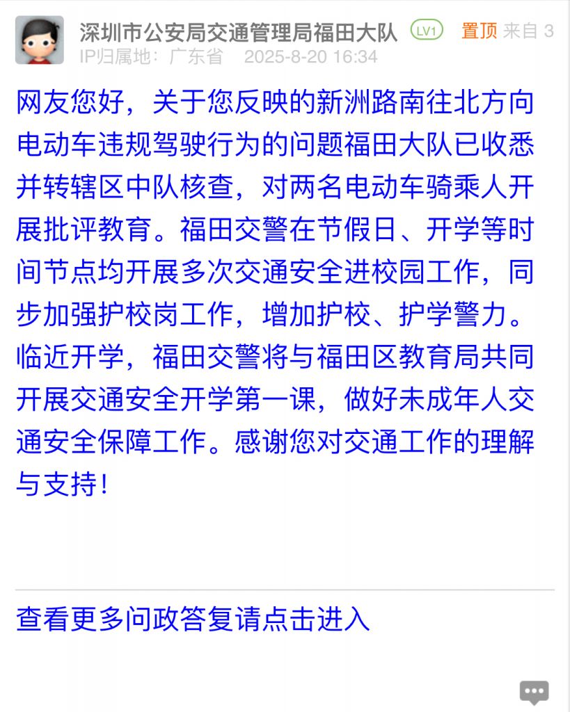 網(wǎng)友您好,關(guān)于您反映的新洲路南往北方向電動(dòng)車違規(guī)駕駛行為的問題福田大隊(duì)已收悉并轉(zhuǎn)轄區(qū)中隊(duì)核查,對兩名電動(dòng)車騎乘人開展批評教育。福田交警在節(jié)假日、開學(xué)等時(shí)間節(jié)點(diǎn)均開展多次交通安全進(jìn)校園工作,同步加強(qiáng)護(hù)校崗工作,增加護(hù)校、護(hù)學(xué)警力。臨近開學(xué),福田交警將與福田區(qū)教育局共同開展交通安全開學(xué)第一課,做好未成年人交通安全保障工作。感謝您對交通工作的理解與支持!