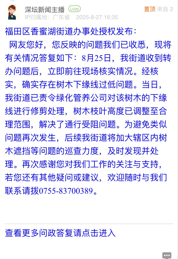 網(wǎng)友您好,您反映的問題我們已收悉,現(xiàn)將有關(guān)情況答復(fù)如下:8月25日,我街道收到轉(zhuǎn)辦問題后,立即前往現(xiàn)場核實(shí)情況。經(jīng)核實(shí),確實(shí)存在樹木下緣線過低問題。當(dāng)日,我街道已責(zé)令綠化管養(yǎng)公司對該樹木的下緣線進(jìn)行修剪處理,樹木枝葉高度已調(diào)整至合理范圍,解決了通行受阻問題。為避免類似問題再次發(fā)生,后續(xù)我街道將加大轄區(qū)內(nèi)樹木遮擋等問題的巡查力度,及時(shí)發(fā)現(xiàn)并處理。再次感謝您對我們工作的關(guān)注與支持,若您還有其他疑問或建議,歡迎隨時(shí)與我們聯(lián)系請撥0755-83700389。