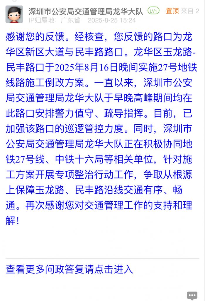 感謝您的反饋。經(jīng)核查,您反饋的路口為龍華區(qū)新區(qū)大道與民豐路路口。龍華區(qū)玉龍路-民豐路口于2025年8月16日晚間實(shí)施27號地鐵線路施工倒改方案。一直以來,深圳市公安局交通管理局龍華大隊(duì)于早晚高峰期間均在此路口安排警力值守、疏導(dǎo)指揮。目前,已加強(qiáng)該路口的巡邏管控力度。同時(shí),深圳市公安局交通管理局龍華大隊(duì)正在積極協(xié)同地鐵27號線、中鐵十六局等相關(guān)單位,針對施工方案開展專項(xiàng)整治行動(dòng)工作,爭取從根源上保障玉龍路、民豐路沿線交通有序、暢通。再次感謝您對交通管理工作的支持和理解!