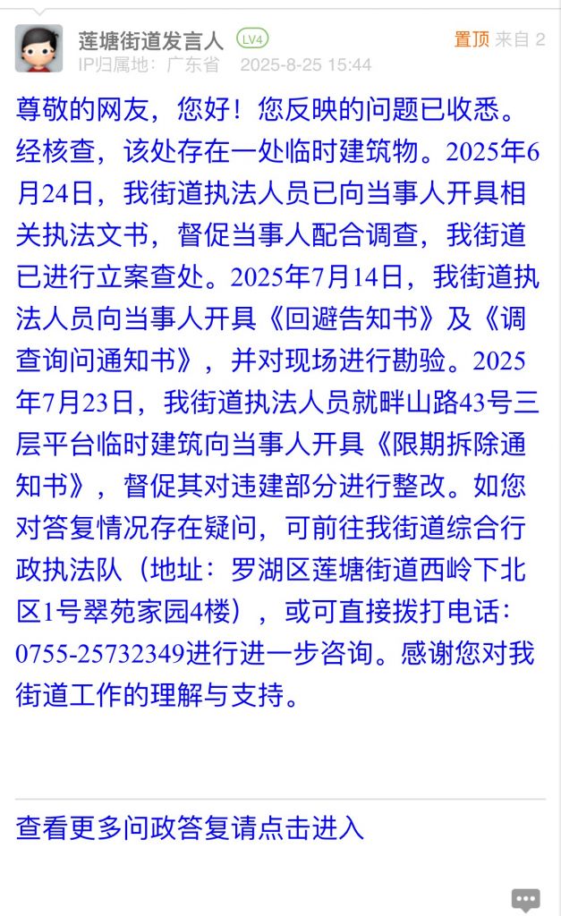 尊敬的網(wǎng)友,您好!您反映的問題已收悉。經(jīng)核查,該處存在一處臨時(shí)建筑物。2025年6月24日,我街道執(zhí)法人員已向當(dāng)事人開具相關(guān)執(zhí)法文書,督促當(dāng)事人配合調(diào)查,我街道已進(jìn)行立案查處。2025年7月14日,我街道執(zhí)法人員向當(dāng)事人開具《回避告知書》及《調(diào)查詢問通知書》,并對現(xiàn)場進(jìn)行勘驗(yàn)。2025年7月23日,我街道執(zhí)法人員就畔山路43號三層平臺(tái)臨時(shí)建筑向當(dāng)事人開具《限期拆除通知書》,督促其對違建部分進(jìn)行整改。如您對答復(fù)情況存在疑問,可前往我街道綜合行政執(zhí)法隊(duì)(地址:羅湖區(qū)蓮塘街道西嶺下北區(qū)1號翠苑家園4樓),或可直接撥打電話:0755-25732349進(jìn)行進(jìn)一步咨詢。感謝您對我街道工作的理解與支持。