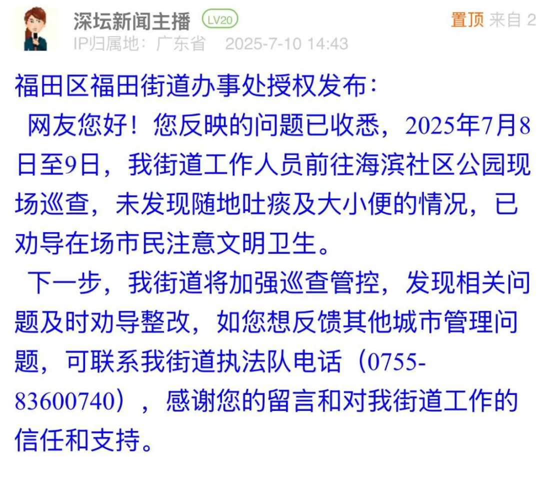 案例點(diǎn)評(píng):對(duì)于市民反映的路面油污問題,布吉街道辦立即安排環(huán)衛(wèi)部門進(jìn)行清洗,并于第二日在問政帖文下進(jìn)行回復(fù),以現(xiàn)場圖片展示路面清理效果,表示將加強(qiáng)后續(xù)巡查。此次處置展現(xiàn)了基層部門高效務(wù)實(shí)的問題處理能力,為城市道路環(huán)境管理提供了快速響應(yīng)與長效維護(hù)相結(jié)合的實(shí)踐范例,切實(shí)回應(yīng)了市民對(duì)潔凈環(huán)境的期待。