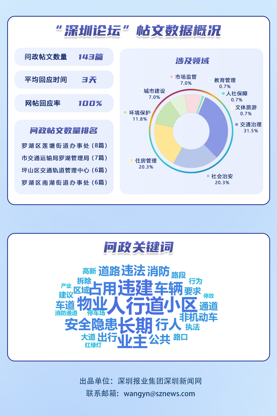 榜單帖文數(shù)據(jù)源自深圳論壇,均為網(wǎng)民點(diǎn)名希望涉事單位回應(yīng)的網(wǎng)帖,共涵蓋68個(gè)單位、143篇網(wǎng)帖。所采集帖文發(fā)布時(shí)間為2025年7月1日至7月31日,采集截止時(shí)間為2025年8月15日。