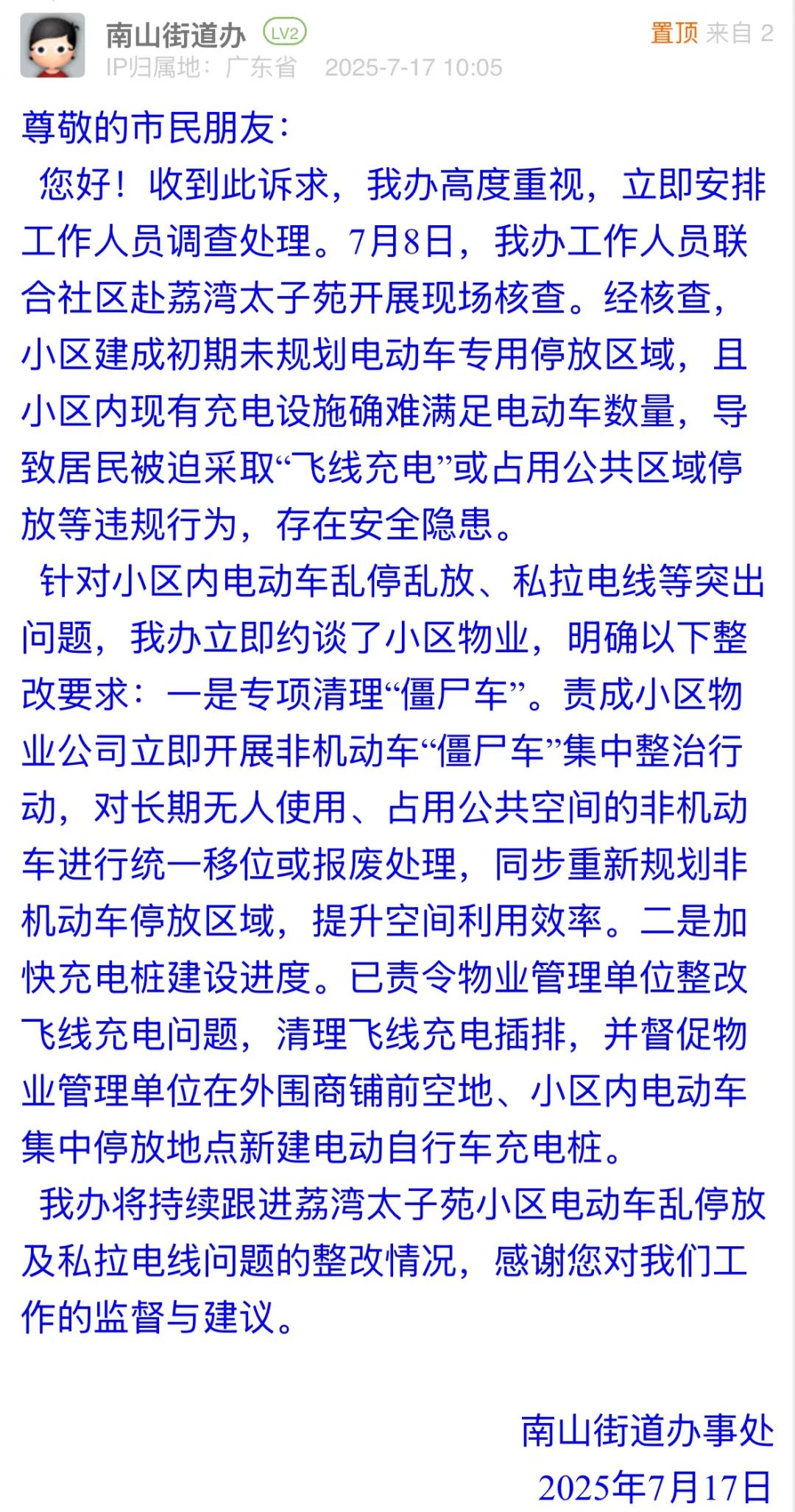 針對(duì)小區(qū)內(nèi)電動(dòng)車亂停放、私拉電線等存在安全隱患的行為,南山街道辦接訴后迅速聯(lián)合社區(qū)核查,說明了歷史規(guī)劃不足的核心病因,通過約談物業(yè)推動(dòng)整改,從“應(yīng)急響應(yīng)”到“系統(tǒng)治理”的務(wù)實(shí)舉措,回應(yīng)了市民對(duì)消防通道暢通、用電安全的關(guān)切,以“標(biāo)本兼治”的治理思路,為老舊小區(qū)電動(dòng)車管理提供了可復(fù)制的解決方案。