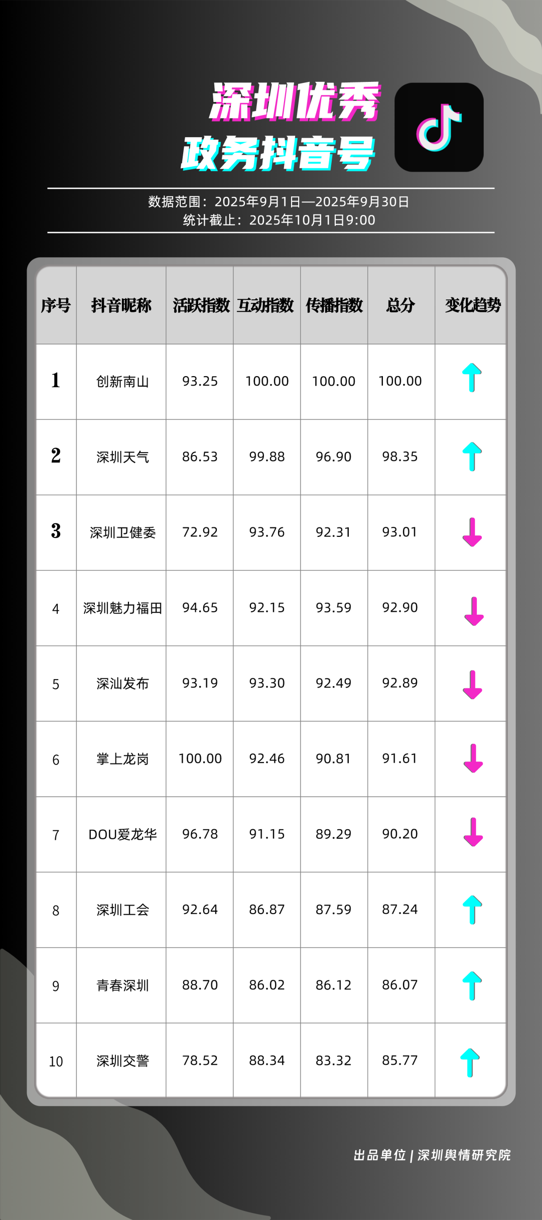 9月,深圳政務(wù)新媒體矩陣持續(xù)優(yōu)化內(nèi)容生態(tài),各單位依托平臺(tái)特色深化服務(wù)效能,南山區(qū)、市衛(wèi)生健康委員會(huì)、市氣象局(臺(tái))、龍崗區(qū)、福田區(qū)、龍華區(qū)、深汕特別合作區(qū)、市應(yīng)急管理局、中國(guó)共產(chǎn)主義青年團(tuán)深圳市委員會(huì)、光明區(qū)的新媒體矩陣入選“深圳優(yōu)秀政務(wù)新媒體矩陣”榜單。9月,南山區(qū)在短視頻平臺(tái)表現(xiàn)突出,抖音、微信視頻號(hào)平臺(tái)均獲滿分;市衛(wèi)生健康委員會(huì)輸出深度內(nèi)容,位列榜單第二;市氣象局(臺(tái))新媒體矩陣居于榜單第三,在9月發(fā)布臺(tái)風(fēng)相關(guān)天氣提醒,獲得公眾廣泛關(guān)注。此外,龍崗區(qū)、福田區(qū)、龍華區(qū)、深汕特別合作區(qū)新媒體矩陣持續(xù)推出優(yōu)質(zhì)內(nèi)容,共同展現(xiàn)了深圳在塑造現(xiàn)代化形象、提升數(shù)字治理能力上的創(chuàng)新引領(lǐng)作用。
