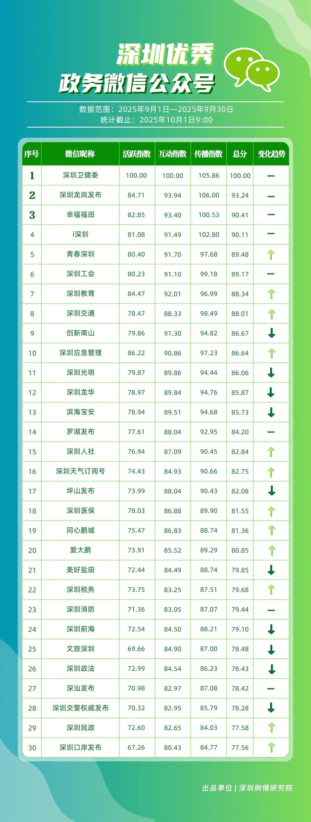 9月,“深圳衛(wèi)健委”“深圳龍崗發(fā)布”“幸福福田”“i深圳”“青春深圳”“深圳工會(huì)”“深圳教育”“深圳交通”“創(chuàng)新南山”“深圳應(yīng)急管理”等30個(gè)政務(wù)微信公眾號(hào)榮登“深圳優(yōu)秀政務(wù)微信公眾號(hào)”榜單。9月,“深圳衛(wèi)健委”以總分100.00的成績(jī)蟬聯(lián)榜單首位,其憑借突破常規(guī)視角的選題,解讀專業(yè)健康知識(shí),引發(fā)大量網(wǎng)民共鳴,內(nèi)容質(zhì)量與傳播力形成雙向賦能;“深圳龍崗發(fā)布”以總分93.24位居第二,聚焦區(qū)域民生服務(wù)升級(jí)等動(dòng)態(tài),信息觸達(dá)率不斷提升;“幸福福田”圍繞商圈經(jīng)濟(jì)復(fù)蘇、文化節(jié)慶活動(dòng)等主題開(kāi)展系列宣傳,增強(qiáng)區(qū)域活力展示,位列第三;“i深圳”“青春深圳”“深圳工會(huì)”等也持續(xù)優(yōu)化賬號(hào)內(nèi)容,通過(guò)實(shí)用信息推送強(qiáng)化政務(wù)服務(wù)定位。