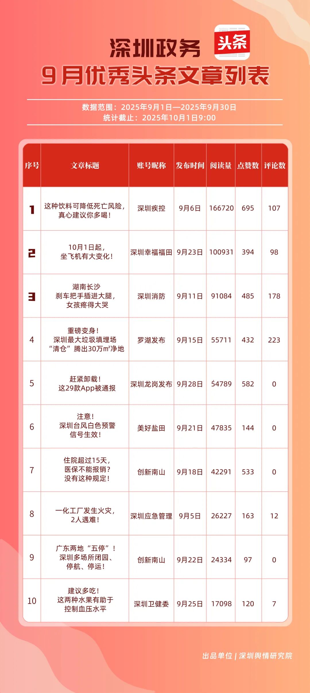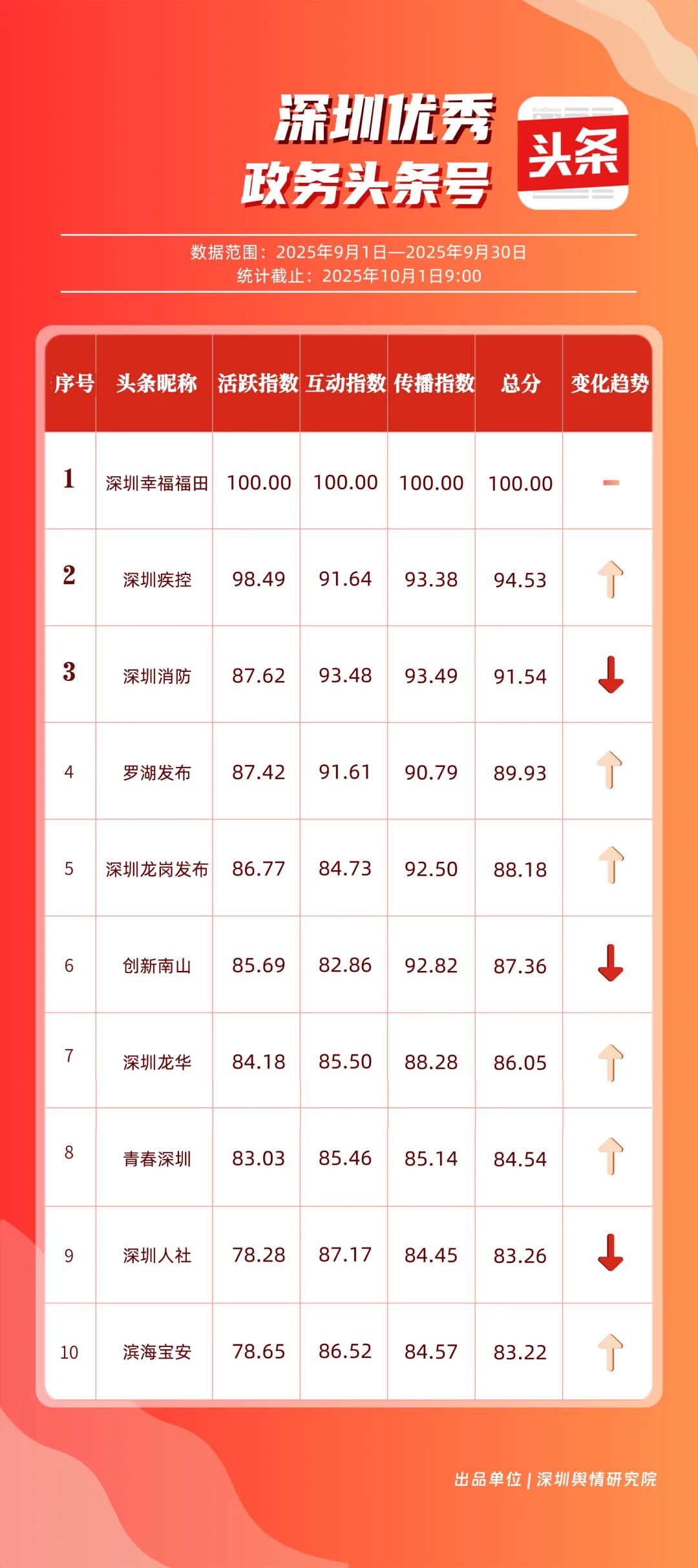 9月,“深圳幸福福田”“深圳疾控”“深圳消防”“羅湖發(fā)布”“深圳龍崗發(fā)布”“創(chuàng)新南山”“深圳龍華”“青春深圳”“深圳人社”“濱海寶安”共10個(gè)政務(wù)頭條號(hào)入選“優(yōu)秀政務(wù)頭條號(hào)”榜單?!吧钲谛腋8L铩狈€(wěn)居榜單首位,在傳播、互動(dòng)等方面均表現(xiàn)卓越;“深圳疾控”關(guān)注民生健康,有關(guān)“喝茶的好處”“非正規(guī)醫(yī)美針風(fēng)險(xiǎn)”兩篇文章閱讀均超10萬(wàn)次,為市民提供健康信息;“深圳消防”聚焦消防安全領(lǐng)域,提醒市民注意安全。相關(guān)上榜賬號(hào)表現(xiàn)優(yōu)異,注重內(nèi)容實(shí)用化、互動(dòng)場(chǎng)景化,彰顯了政務(wù)新媒體的服務(wù)效能。