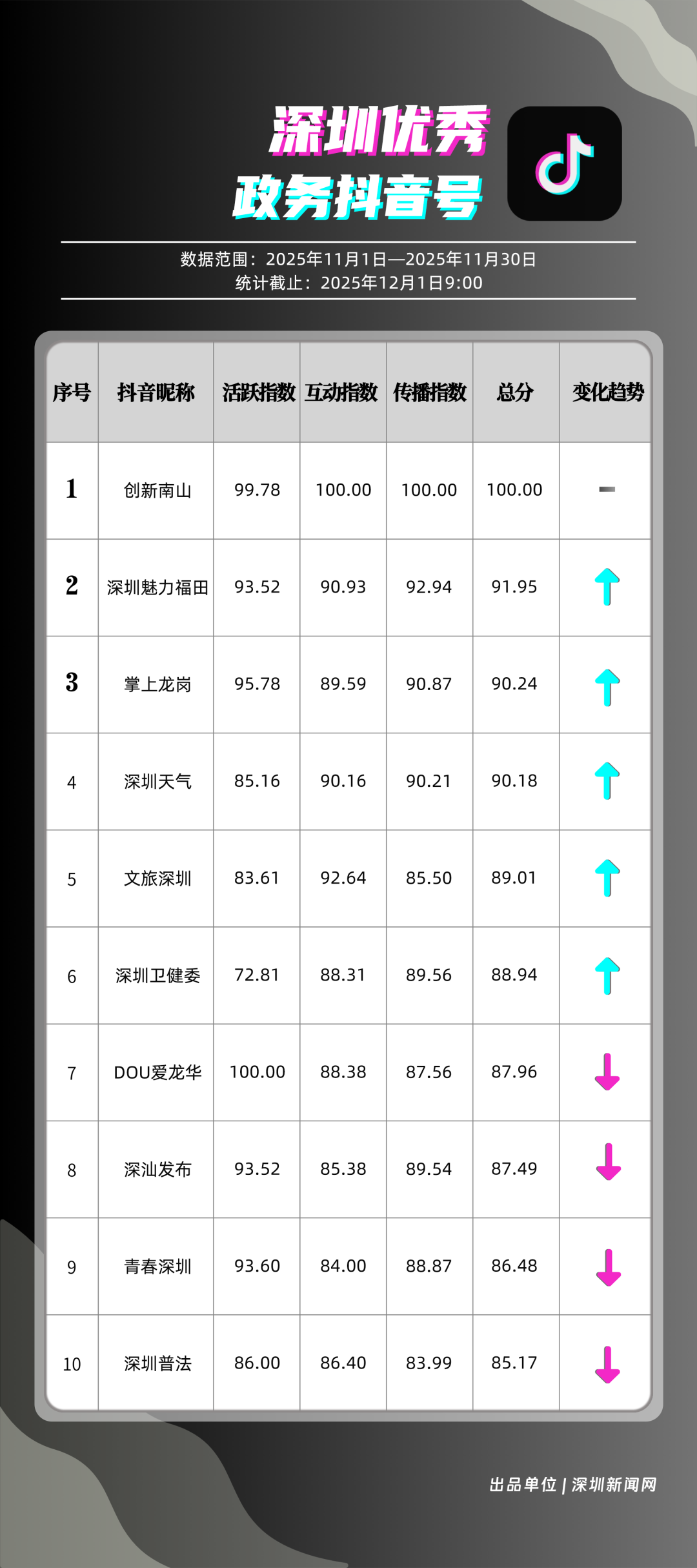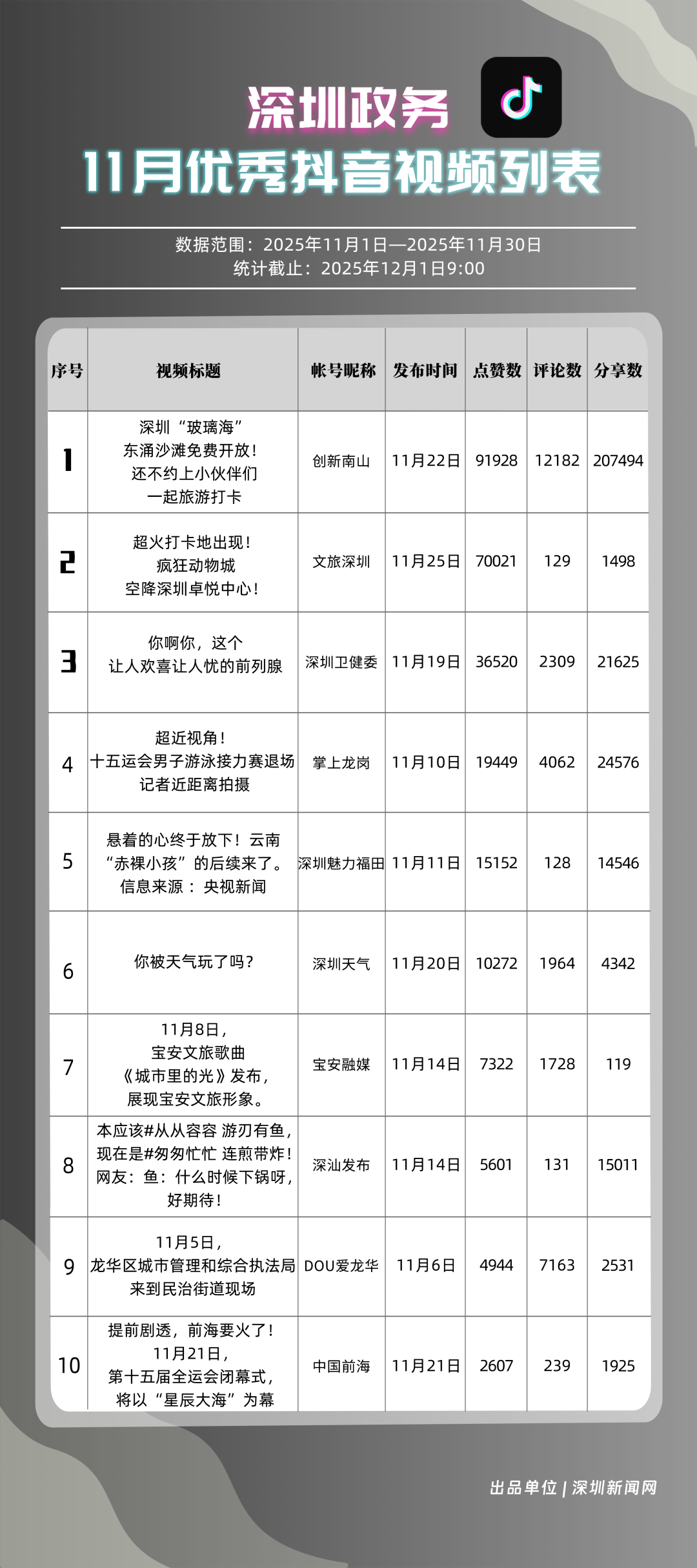 11月,獲得“優(yōu)秀政務(wù)抖音號(hào)”稱號(hào)的是“創(chuàng)新南山”“深圳魅力福田”“掌上龍崗”“深圳天氣”“文旅深圳”“深圳衛(wèi)健委”“DOU愛龍華”“深汕發(fā)布”“青春深圳”“深圳普法”。“創(chuàng)新南山”多篇文旅、健康及出行相關(guān)內(nèi)容分享超10萬次,在互動(dòng)、傳播方面表現(xiàn)亮眼,蟬聯(lián)榜首;“深圳魅力福田”在各方面指數(shù)評(píng)分較為均衡,位列第二名;“掌上龍崗”在活躍指數(shù)得分較高,能夠較好均衡內(nèi)容數(shù)量與質(zhì)量,位居第三,排名較上期有所提高。“深圳天氣”“文旅深圳”等賬號(hào)緊隨其后,得分均在90分上下。上榜優(yōu)秀政務(wù)抖音號(hào)通過深耕內(nèi)容創(chuàng)作,收獲了高點(diǎn)贊、高分享的傳播效果,也推動(dòng)評(píng)論區(qū)形成正向互動(dòng)生態(tài),最終以優(yōu)質(zhì)內(nèi)容為核心載體,增強(qiáng)政務(wù)賬號(hào)影響力。