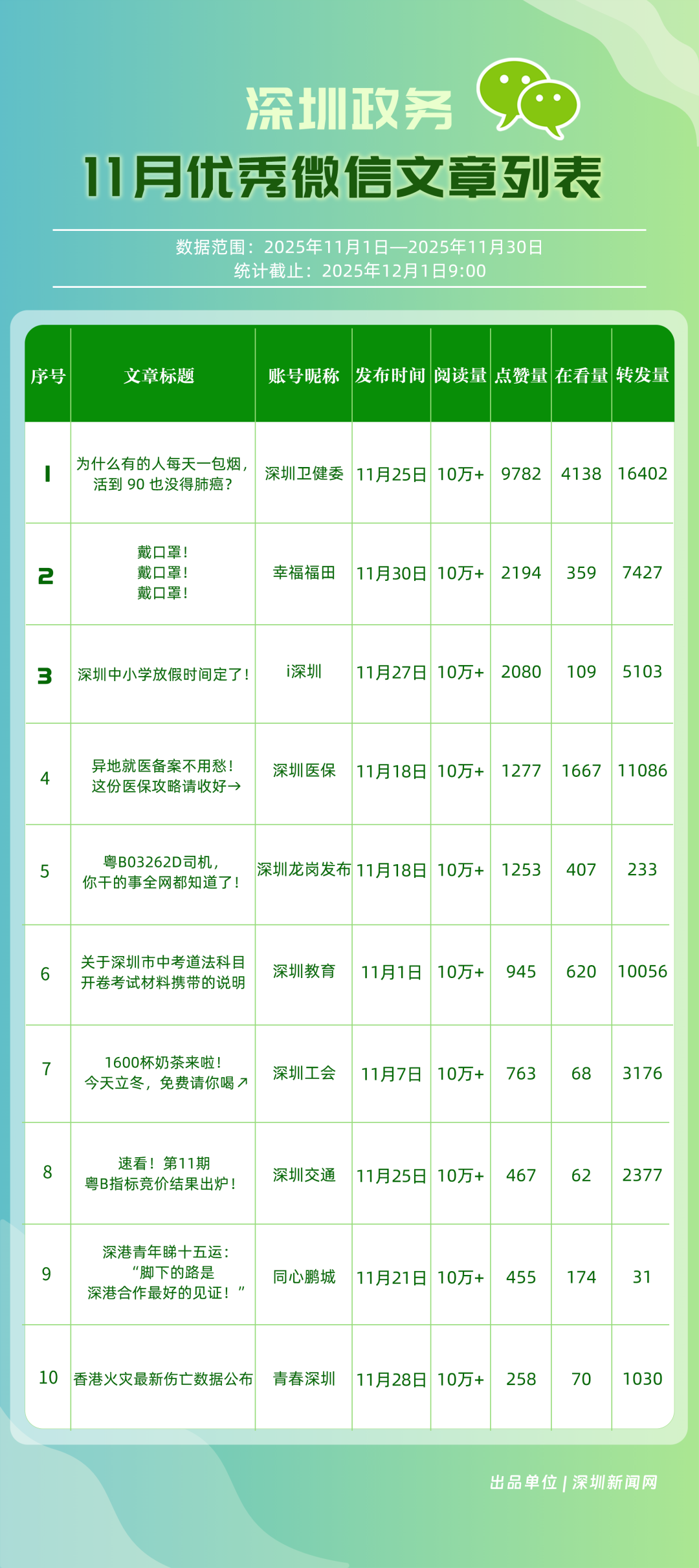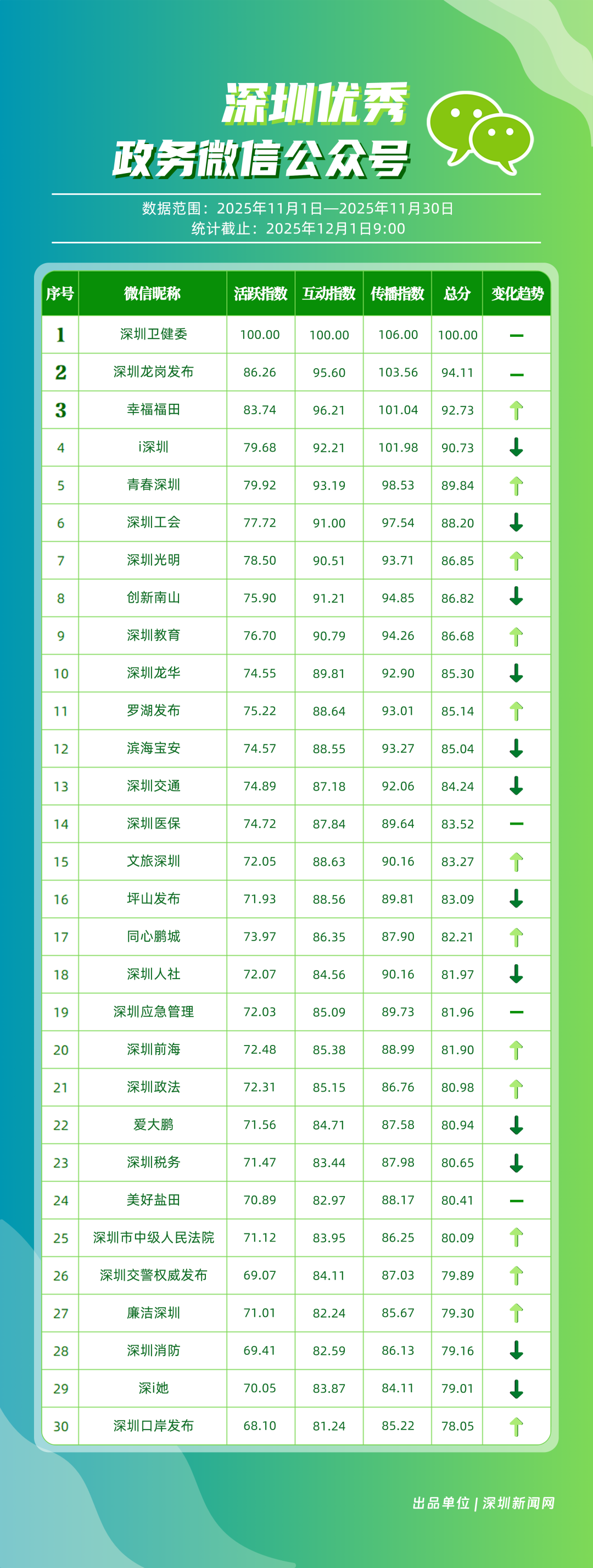 11月,“深圳衛(wèi)健委”“深圳龍崗發(fā)布”“幸福福田”“i深圳”“青春深圳”“深圳工會(huì)”“深圳光明”“創(chuàng)新南山”“深圳教育”“深圳龍華”等30個(gè)政務(wù)微信公眾號(hào)榮登“深圳優(yōu)秀政務(wù)微信公眾號(hào)”榜單。11月,“深圳衛(wèi)健委”在活躍、互動(dòng)、傳播方面均取得較好成效,以滿分位于榜單首位;“深圳龍崗發(fā)布”在傳播、互動(dòng)指數(shù)得分較高,十余篇文章閱讀量超10萬次,位居榜單第二;“幸福福田”持續(xù)發(fā)布優(yōu)秀內(nèi)容,排名第三?!癷深圳”“青春深圳”“深圳工會(huì)”等政務(wù)賬號(hào)在信息發(fā)布中拓展信息維度、深化服務(wù)場景,評(píng)分在88分以上。上榜微信公眾號(hào)以高質(zhì)量內(nèi)容為核心抓手,在政務(wù)傳播賽道樹立了標(biāo)桿形象,成為兼具影響力與公信力的典范。