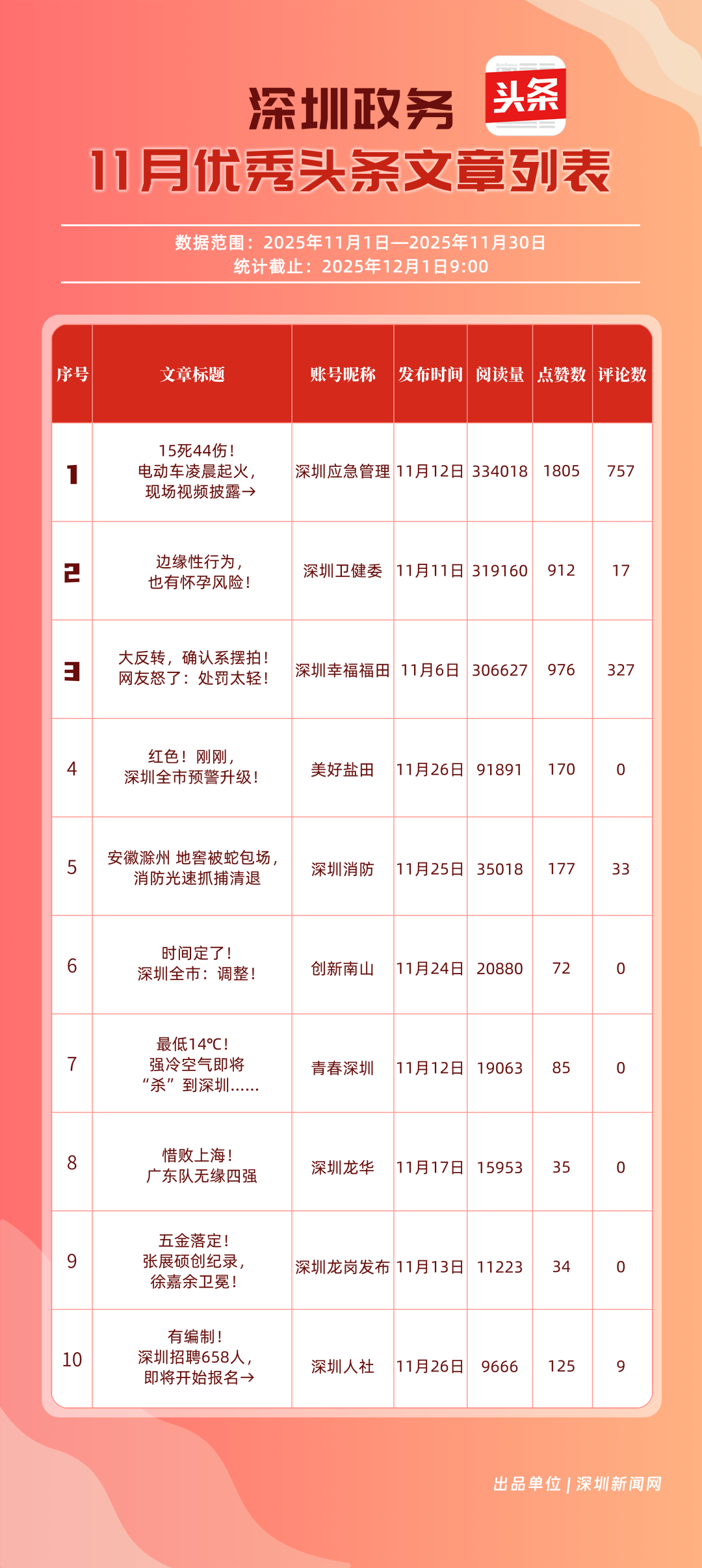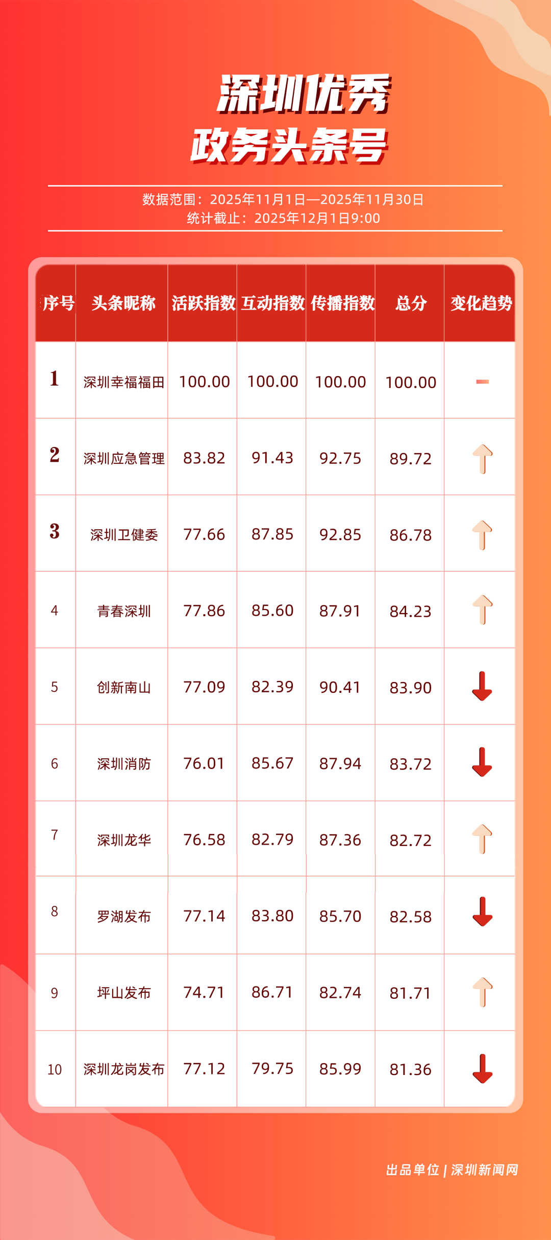 11月,“深圳幸福福田”“深圳應(yīng)急管理”“深圳衛(wèi)健委”“青春深圳”“創(chuàng)新南山”“深圳消防”“深圳龍華”“羅湖發(fā)布”“坪山發(fā)布”“深圳龍崗發(fā)布”共10個(gè)政務(wù)頭條號(hào)入選“優(yōu)秀政務(wù)頭條號(hào)”榜單?!吧钲谛腋8L铩卑l(fā)揮穩(wěn)定,以滿分成績蟬聯(lián)榜首,彰顯出強(qiáng)大的政務(wù)傳播力與影響力;“深圳應(yīng)急管理”積極發(fā)布應(yīng)急、安全類內(nèi)容,位居第二;“深圳衛(wèi)健委”則以優(yōu)質(zhì)健康類信息吸引市民關(guān)注,排名上升至第3位。“青春深圳”“創(chuàng)新南山”“深圳消防”得分在83分以上。相關(guān)上榜賬號(hào)以內(nèi)容創(chuàng)新為紐帶,聚焦民生,為城市治理現(xiàn)代化與民生服務(wù)精細(xì)化注入了鮮活力量。