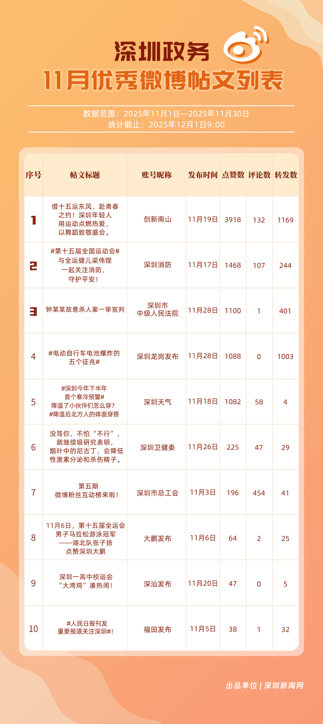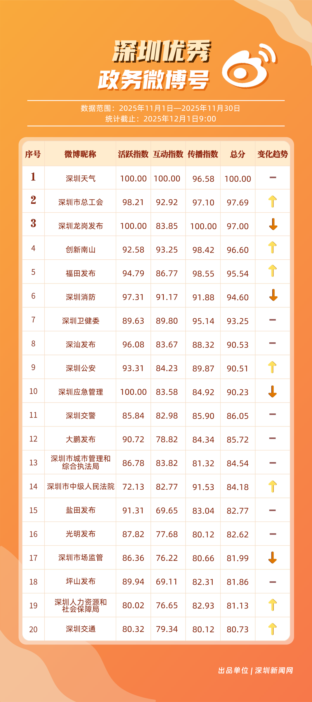 11月,20個(gè)賬號(hào)入選“優(yōu)秀政務(wù)微博號(hào)”榜單,其中包括:“深圳天氣”“深圳市總工會(huì)”“深圳龍崗發(fā)布”“創(chuàng)新南山”“福田發(fā)布”“深圳消防”“深圳衛(wèi)健委”“深汕發(fā)布”“深圳公安”“深圳應(yīng)急管理”等。其中,“深圳天氣”高頻次發(fā)布天氣類信息,受到網(wǎng)民肯定,蟬聯(lián)榜首;“深圳市總工會(huì)”發(fā)布互動(dòng)抽獎(jiǎng)、十五運(yùn)等多元內(nèi)容,排名提升至第二;“深圳龍崗發(fā)布”在傳播指數(shù)獲得較高得分,助力其位列第三。上榜優(yōu)秀政務(wù)微博賬號(hào)以優(yōu)秀內(nèi)容提升賬號(hào)競爭力,贏得公眾認(rèn)可,實(shí)現(xiàn)了政務(wù)信息的有效傳播,為政務(wù)新媒體的內(nèi)容運(yùn)營與價(jià)值傳遞提供參考。