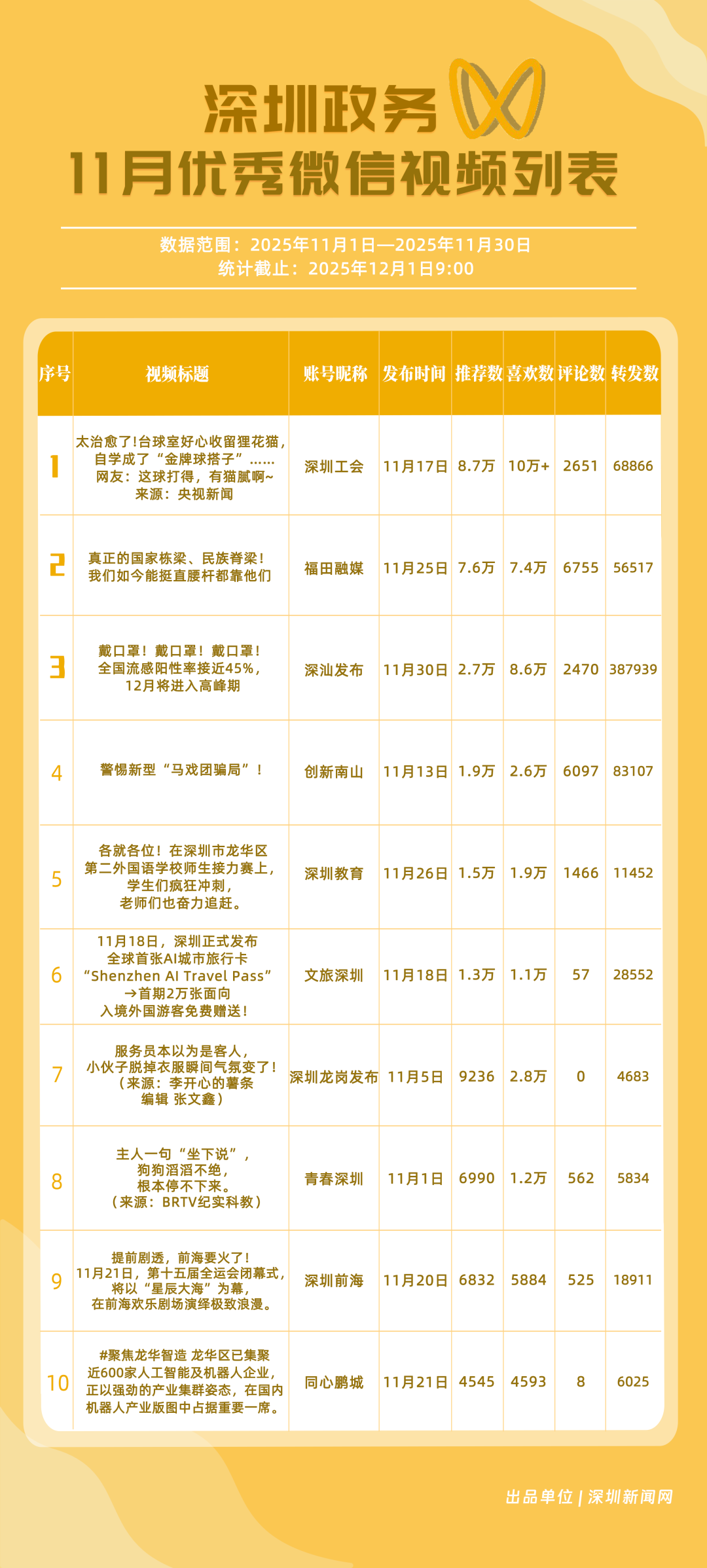 11月,“福田融媒”“深汕發(fā)布”“深圳工會(huì)”“創(chuàng)新南山”“深圳教育”“文旅深圳”“深圳光明”“深圳應(yīng)急管理”“深圳天氣”“深圳龍華”榮獲“優(yōu)秀政務(wù)微信視頻號(hào)”稱號(hào)。“福田融媒”月總轉(zhuǎn)發(fā)量超60萬次,各方面發(fā)揮穩(wěn)定,位居榜單第一;“深汕發(fā)布”一條“流感陽性”視頻提醒市民關(guān)注健康信息,單條視頻轉(zhuǎn)發(fā)超30萬次,助推其位列榜單第二名;“深圳工會(huì)”積極轉(zhuǎn)載網(wǎng)絡(luò)熱門信息,內(nèi)容多元,位列榜單第三名?!皠?chuàng)新南山”“深圳教育”等賬號(hào)緊隨其后。上榜微信視頻號(hào)以輕量化短視頻為載體,將政務(wù)信息轉(zhuǎn)化為公眾喜聞樂見的內(nèi)容形式,最終打造出兼具傳播力與親和力的政務(wù)宣傳新名片。