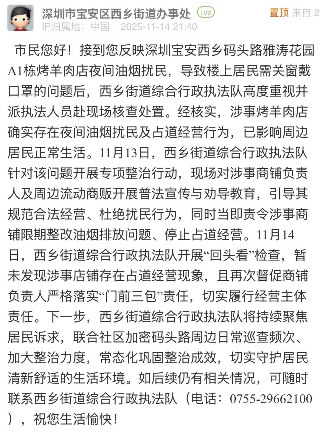 案例點評:接到市民反映后,街道迅速響應,當日開展核查,次日回應進展,處置高效。針對涉事店鋪油煙問題,執(zhí)法隊不僅現(xiàn)場開展普法勸導,責令商鋪限期整改,更在次日開展“回頭看”檢查,及時跟進整改進度、壓實經營主體責任?;貞?,街道明確下一步將聯(lián)合社區(qū)加密日常巡查、加大整治力度,常態(tài)化鞏固整治成效,體現(xiàn)出緊盯民生痛點、深耕基層精細化治理、全力守護居民舒適生活環(huán)境的決心。