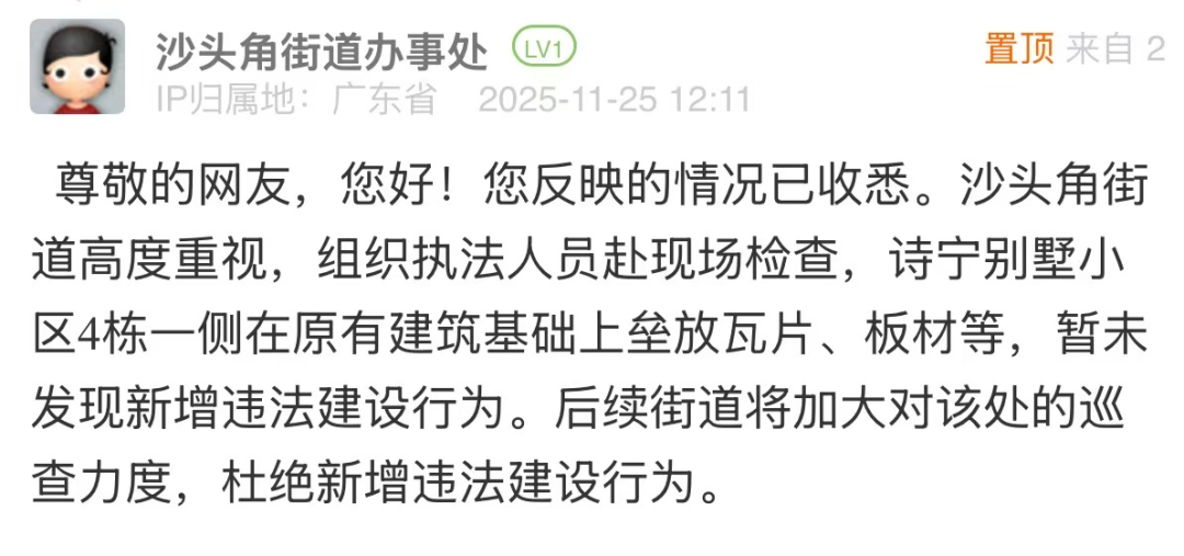 針對網民投訴的小區(qū)違建問題,街道回應僅以“未發(fā)現(xiàn)新增違法建設行為”簡單回復,尚有完善空間。若該點位存在建設年代久遠、權屬界定模糊、涉及多主體協(xié)調等客觀難點,可適度說明,并在回應中補充核查細節(jié),說明后續(xù)處置方向與階段計劃,讓回應更具可信度和實操性,回應市民對“依法履職”的期待。