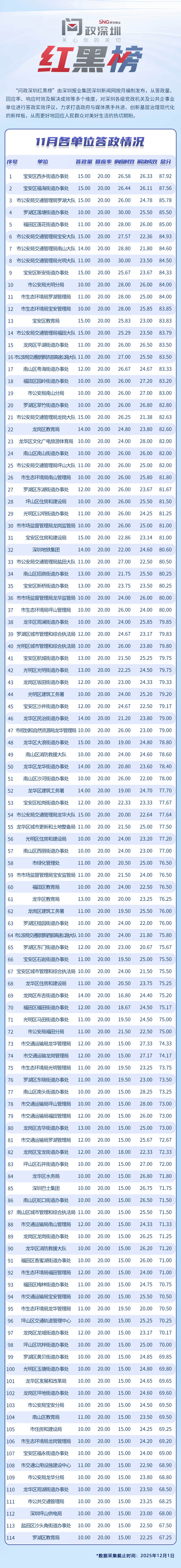 為探尋媒體如何精準賦能基層治理現(xiàn)代化的“深圳路徑”,深圳報業(yè)集團正式掛牌成立“問政深圳”工作室,旨在進一步推動網絡問政工作的高效開展。為確保相關工作更加契合實際需求,深圳報業(yè)集團深圳新聞網按照“最快速度辦結”的總體要求,將原有月度榜單創(chuàng)新升級為“問政深圳紅黑榜”,并對評分體系進行了細致優(yōu)化。該榜單從答政量、回應率、響應時效及解決成效等多個維度,對深圳各級黨政機關及公共企事業(yè)單位進行答政實效評議,力求打造政府與媒體攜手共進、創(chuàng)新基層治理現(xiàn)代化的新樣板,從而更好地回應人民群眾對美好生活的熱切期盼。