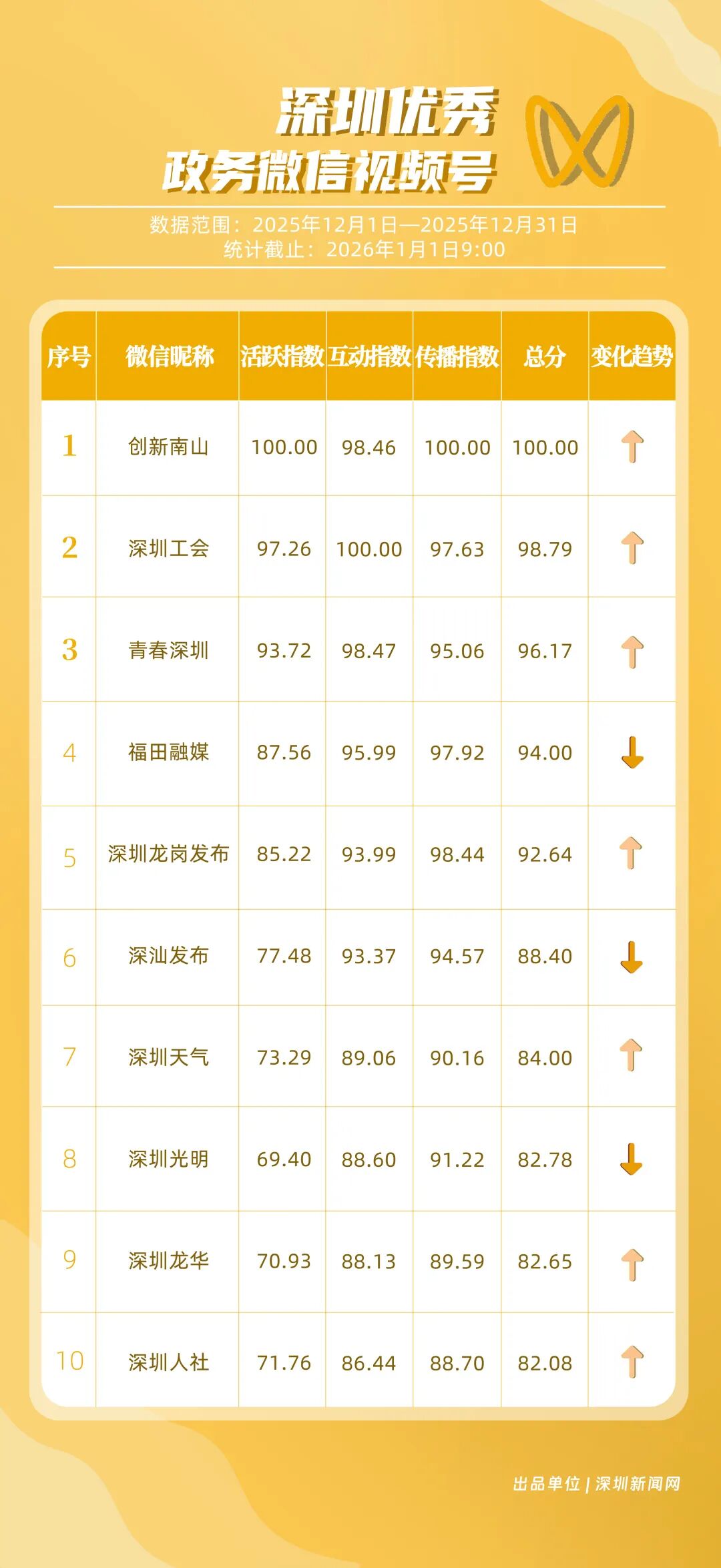 12月,“創(chuàng)新南山”“深圳工會(huì)”“青春深圳”“福田融媒”“深圳龍崗發(fā)布”“深汕發(fā)布”“深圳天氣”“深圳光明”“深圳龍華”“深圳人社”榮獲“優(yōu)秀政務(wù)微信視頻號(hào)”稱號(hào)。“創(chuàng)新南山”活躍指數(shù)、傳播指數(shù)均獲滿分,月作品總轉(zhuǎn)發(fā)量超70萬,領(lǐng)跑榜單;“深圳工會(huì)”積極發(fā)布熱點(diǎn)、民生類內(nèi)容,精準(zhǔn)對(duì)接市民需求,排名上升至第二名;“青春深圳”互動(dòng)指數(shù)超98分,以高互動(dòng)量位列榜單第三名?!案L锶诿健薄吧钲邶垗彴l(fā)布”兩賬號(hào)立足區(qū)域特色深耕內(nèi)容,得分超90分。上榜微信視頻號(hào)以輕量化短視頻為載體,傳播公眾喜聞樂見的政務(wù)、民生內(nèi)容,打造出兼具傳播力與親和力的政務(wù)宣傳新名片。