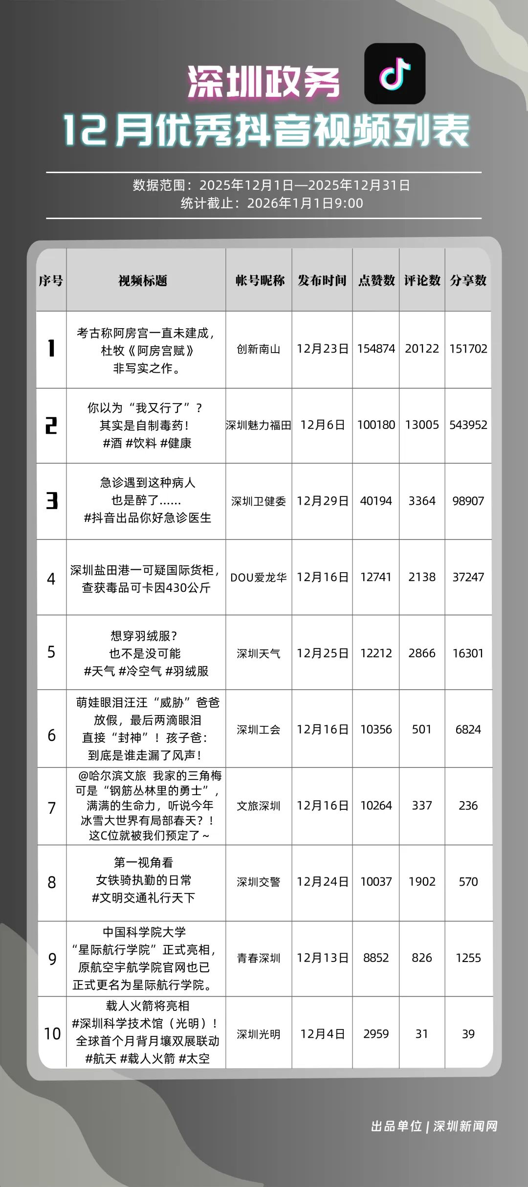 12月,獲得“優(yōu)秀政務(wù)抖音號(hào)”稱號(hào)的是“創(chuàng)新南山”“深圳魅力福田”“深圳衛(wèi)健委”“深圳天氣”“DOU愛龍華”“青春深圳”“深圳交警”“深汕發(fā)布”“深圳工會(huì)”“文旅深圳”?!皠?chuàng)新南山”積極傳播傳統(tǒng)文化、民生健康等多元內(nèi)容,當(dāng)月視頻總點(diǎn)贊數(shù)超120萬,位居榜首;“深圳魅力福田”內(nèi)容激發(fā)用戶主動(dòng)轉(zhuǎn)發(fā)熱情,在傳播指數(shù)評(píng)分較高,位列第二名;“深圳衛(wèi)健委”聚焦民生健康話題,產(chǎn)出高質(zhì)量視頻內(nèi)容,排名上升至第三?!吧钲谔鞖狻薄癉OU愛龍華”“青春深圳”等賬號(hào)評(píng)分均在86分以上,反映出賬號(hào)的內(nèi)容質(zhì)量與用戶粘性突出。上榜政務(wù)抖音號(hào)在短視頻傳播賽道持續(xù)深耕,憑借精準(zhǔn)的內(nèi)容定位與創(chuàng)新的傳播手法,成功打造出極具影響力的政務(wù)傳播矩陣。