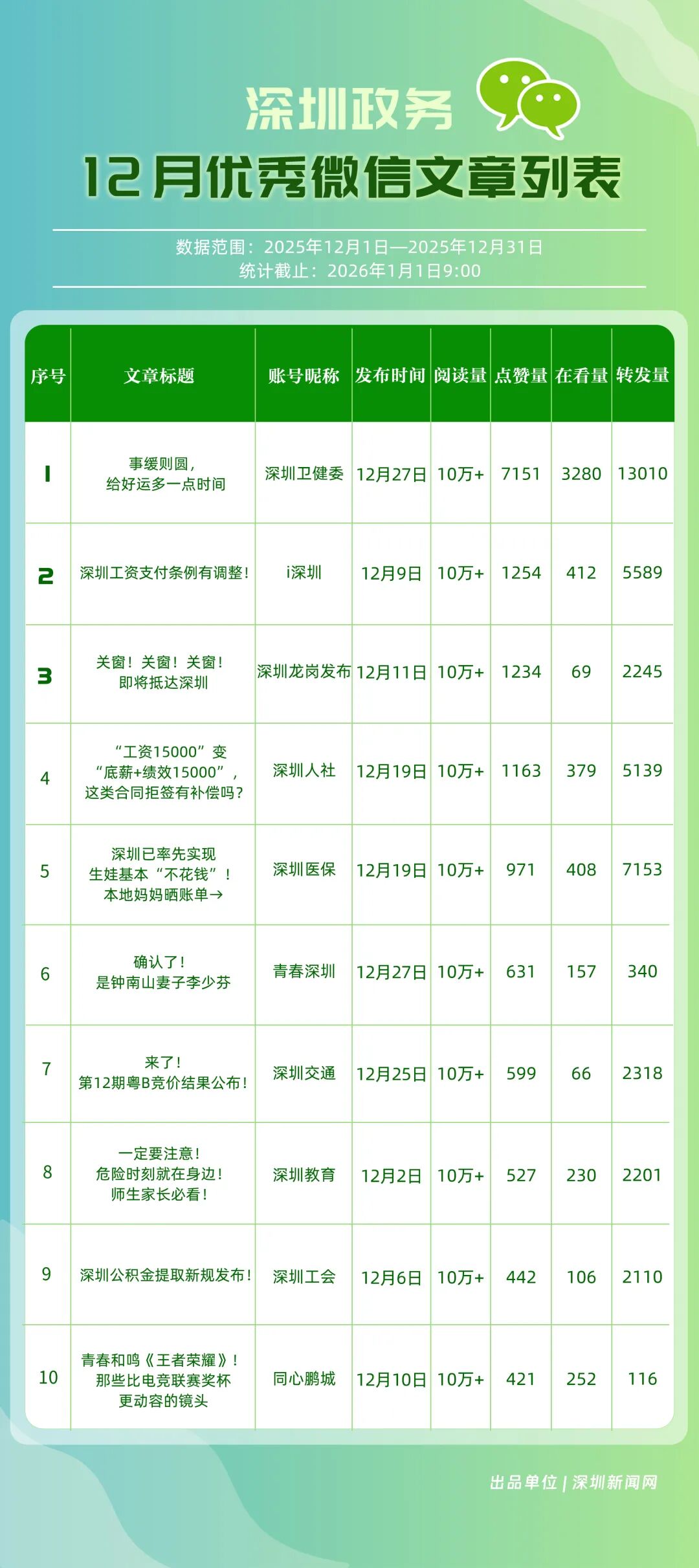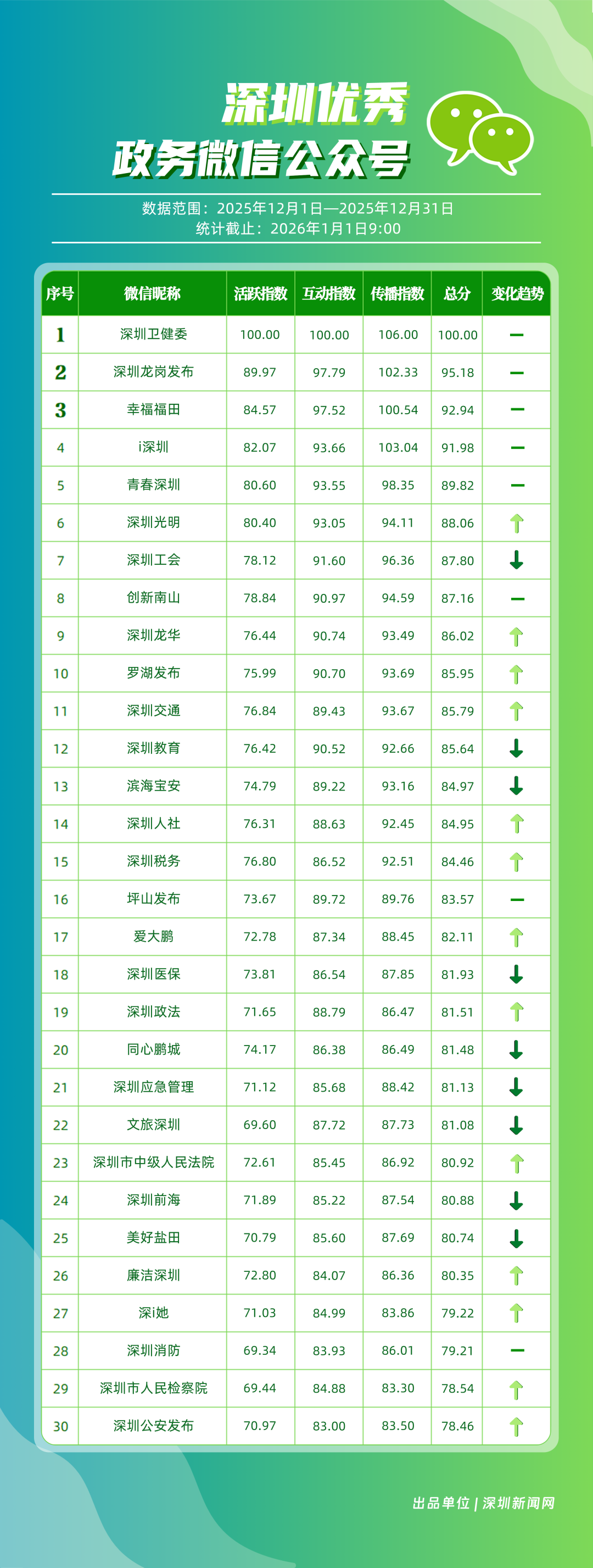 12月,“深圳衛(wèi)健委”“深圳龍崗發(fā)布”“幸福福田”“i深圳”“青春深圳”“深圳光明”“深圳工會(huì)”“創(chuàng)新南山”“深圳龍華”“羅湖發(fā)布”等30個(gè)政務(wù)微信公眾號(hào)榮登“深圳優(yōu)秀政務(wù)微信公眾號(hào)”榜單。12月榜單中,頭部政務(wù)賬號(hào)優(yōu)勢(shì)穩(wěn)固,腰部賬號(hào)競(jìng)爭(zhēng)激烈。“深圳衛(wèi)健委”延續(xù)強(qiáng)勁表現(xiàn),在活躍、互動(dòng)、傳播維度均斬獲滿分,60余篇文章閱讀超10萬,蟬聯(lián)榜首;“深圳龍崗發(fā)布”在互動(dòng)、傳播方面表現(xiàn)亮眼,穩(wěn)居榜單第二;“幸福福田”也在互動(dòng)、傳播方面具備一定優(yōu)勢(shì),以穩(wěn)定的內(nèi)容輸出與用戶口碑,居于榜單第三?!吧钲诠饷鳌薄吧钲邶埲A”“羅湖發(fā)布”等政務(wù)賬號(hào)不斷拓展信息發(fā)布維度、深化服務(wù)場(chǎng)景打造,排名較上期有所提升。上榜微信公眾號(hào)以高質(zhì)量?jī)?nèi)容為核心競(jìng)爭(zhēng)力,在政務(wù)傳播賽道持續(xù)發(fā)力,為推動(dòng)政務(wù)信息公開、服務(wù)民生需求搭建了高效的溝通橋梁。