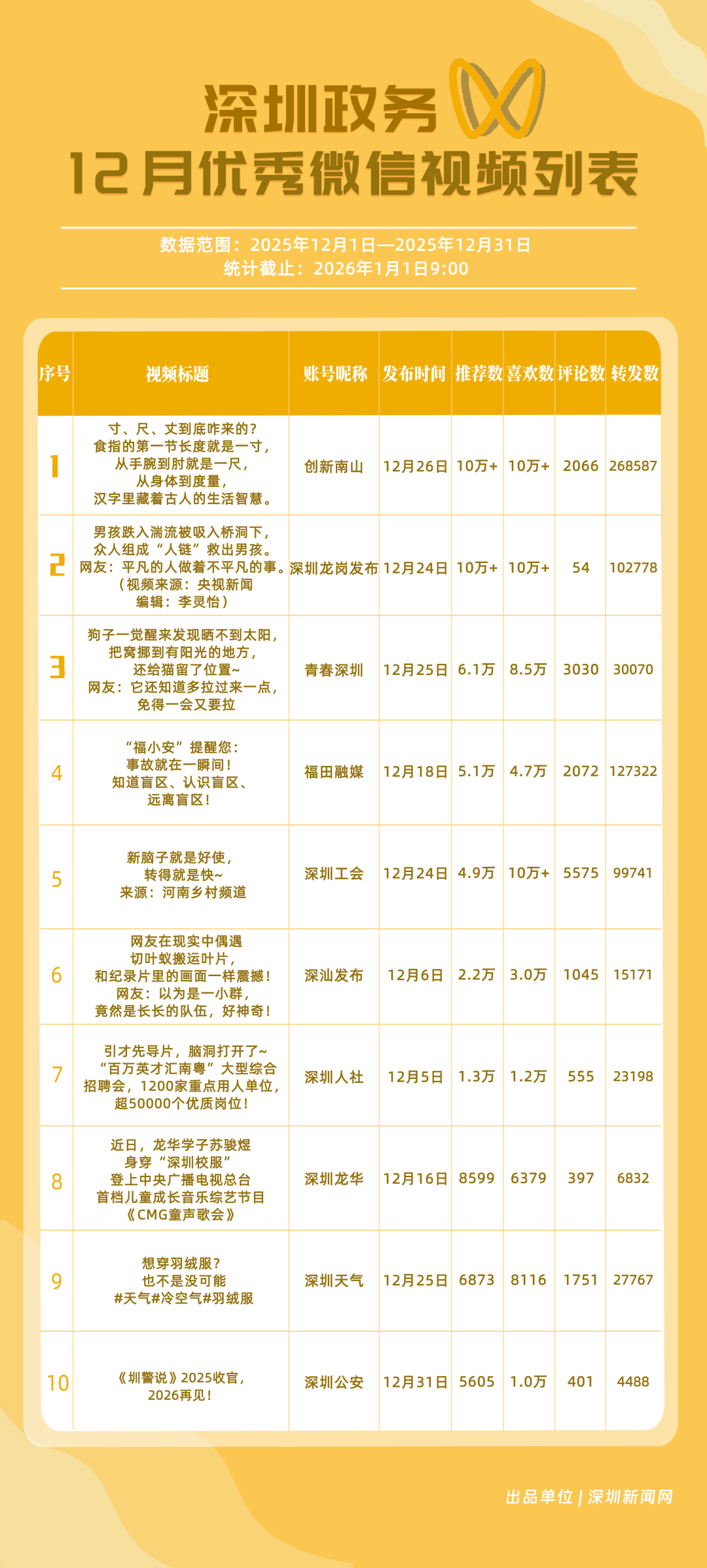 2025年12月期《深圳優(yōu)秀政務(wù)新媒體矩陣》正式發(fā)布,本期上榜矩陣以“接地氣、有溫度、強(qiáng)互動(dòng)”的創(chuàng)作理念,立足民生關(guān)切、深挖區(qū)域特色,以多元?jiǎng)?chuàng)新實(shí)踐在政務(wù)傳播賽道強(qiáng)勢(shì)突圍,展現(xiàn)深圳城市發(fā)展、文化傳承的生動(dòng)圖景,為政務(wù)新媒體高質(zhì)量發(fā)展注入澎湃動(dòng)能。