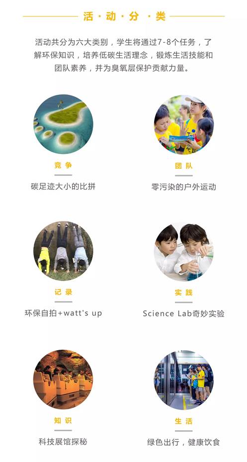 1.在一天時間內挑戰(zhàn)“臭氧英雄·低碳足跡”國際主題活動,學習低碳生活技能,感受中英雙語課堂;