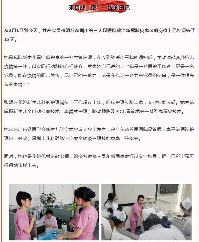 賴碧娟是深圳市婦幼保健院急診黨支部書記、急診科護士長。作為一名老黨員,抱著“疫情快些得到控制,最大程度減少損失”的信念,新冠肺炎疫情期間,她帶頭沖在一線,整個春節(jié)期間基本都在醫(yī)院加班。“我們急診科全體黨員和醫(yī)護人員都嚴(yán)陣以待。只要有需要,所有人都沖在一線?!?/p>